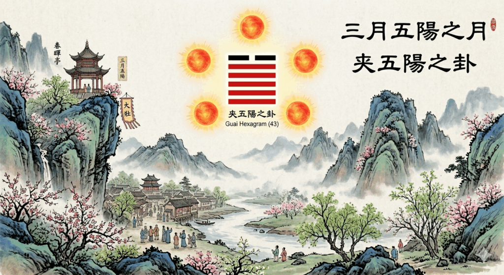 This is the third spring month and the tail of the Big Dipper is pointing at direction Chen. At this time, the trigram is with five Yang lines, so it’s time for the Displacement trigram.