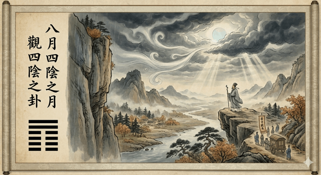 月令仲秋。鄭注曰仲秋者。日月會於壽星(室女座)。而斗建酉之辰也。八月四陰之月。觀四陰之卦。故以配之。